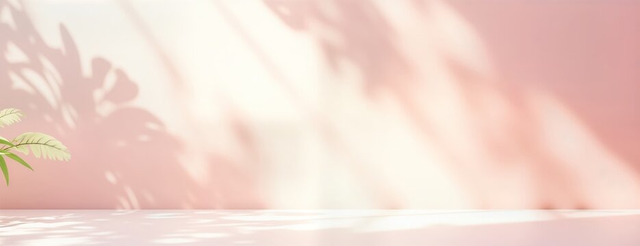 Empty pastel pink studio background with leaf shadows. Soft light, shadows create delicate spring summer mood. Suitable for beauty products items. 3d mockup template for product placement. Ideal for