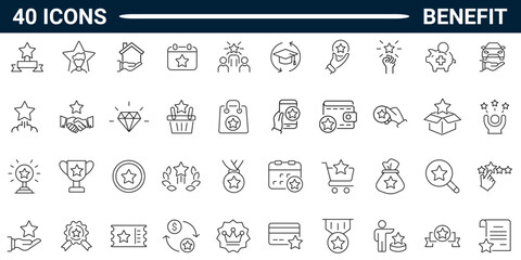 Charging line icon set. Includes reward, bonus, loyalty, star, winner, award, prize, and incentive. Editable stroke. Vector illustration