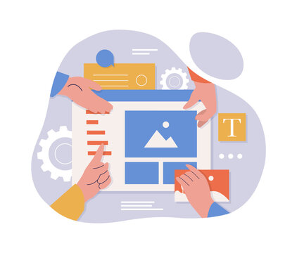 Team people working on web site development. Hands engaged in interface design, software testing, landing page content management system.