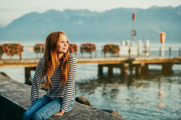 Cute little redheaded girl resting by lake Geneva at sunset, image taken in Lausanne, Switzerland