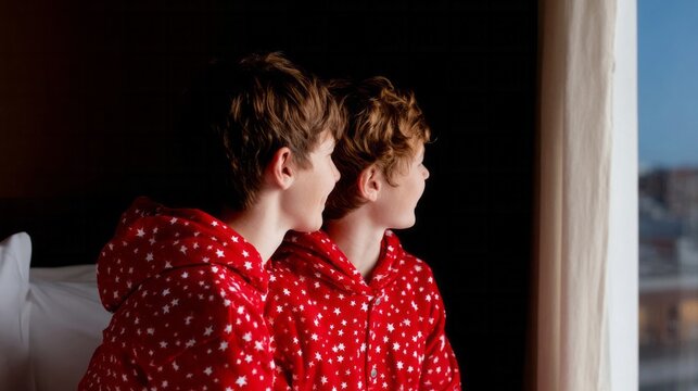 Twin redheaded children in starry pajamas, Scandinavian coziness, Winter Solstice wonder, peering through frosted windows at dawn