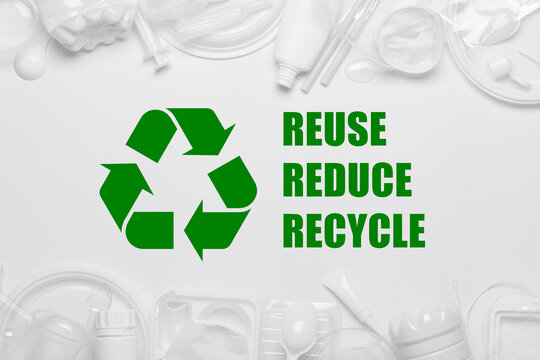Recycling symbol with reuse reduce recycle slogan surrounded by single use plastic objects, packaging plastic products