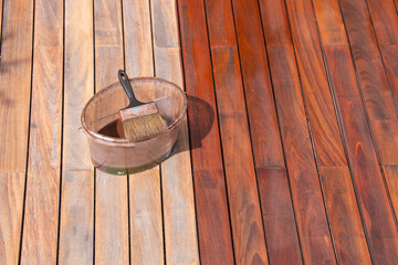 Ipe wood deck renovation treatment and maintenance concept, paint brush on the bucket with oil