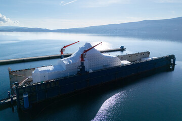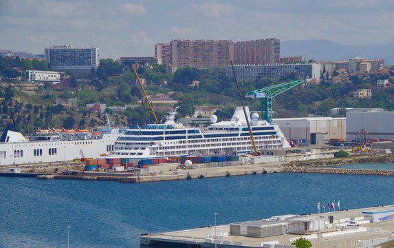 Luxury cruise ship liner get overhaul or renovation or refit or maintenance work in dry dock in Marseille, France
