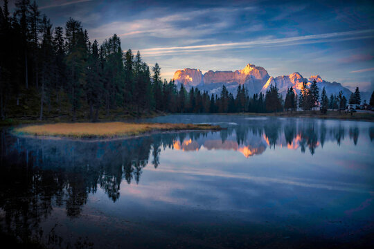 Mountain reflections in Durrensee, Hohlenstein Valley, Dolomites, South Tyrol, Italy