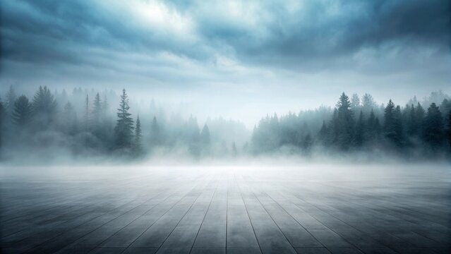 Mysterious thick fog blankets a dense evergreen forest and a vast, empty paved surface under a brooding sky