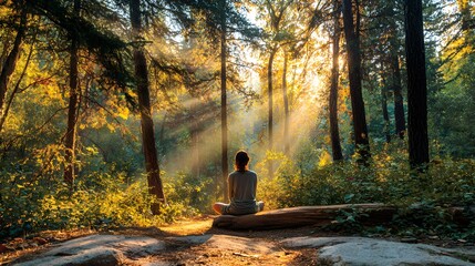 Person practices mindfulness while sitting on a fallen log amidst sunbeams filtering through a dense forest canopy