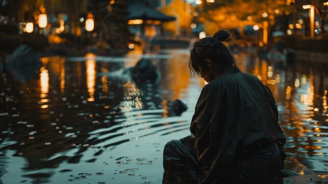 An evocative image showing a solitary samurai in contemplation by calm, reflective waters at dusk