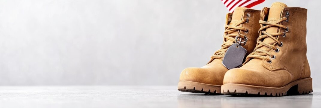 military remembrance art, sophisticated military tribute banner featuring polished combat boots, a folded flag, and dog tags on a reflective surface elegant gradient background adds a professional