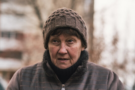 Elderly woman reflecting thoughtfully in urban park during a cool afternoon in early autumn
