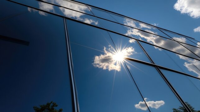 Modern building facade with reflective glass, showcasing sunlight and clouds