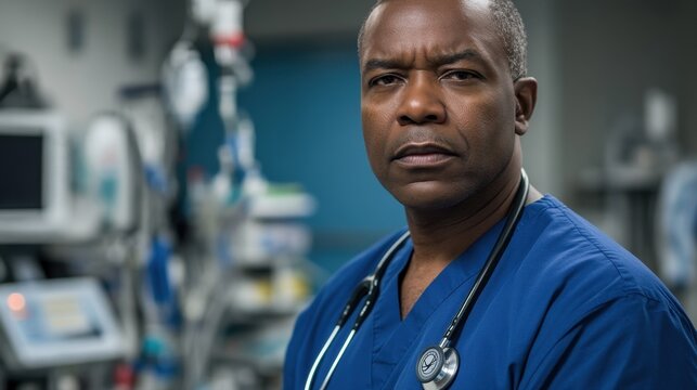 A serious middle-aged Black male doctor stands in a hospital setting, showcasing professionalism and dedication. His confident demeanor reflects a commitment to patient care and medical excellence.