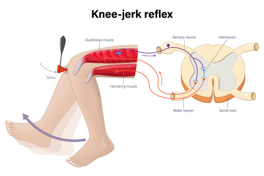 The knee-jerk reflex vector. Reflex action of the leg involves an involuntary response. Sensory neuron, motor neuron and interneuron.