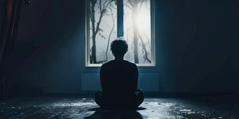 Silhouette of person sitting in front of window with sun shining through, contemplation and introspection concept
