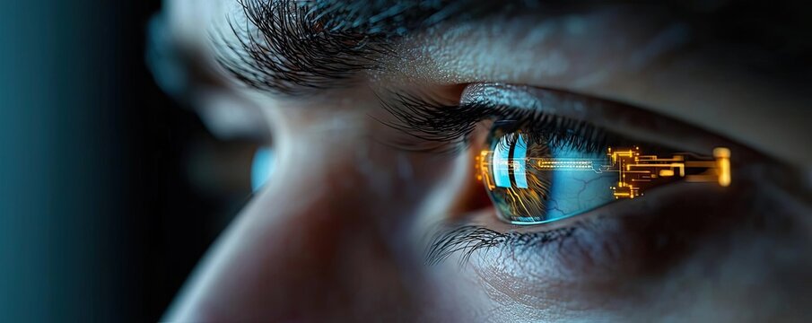 Close-up human eye linked to artificial biotechnology interface concept. Close-up of a futuristic eye reflecting digital technology.