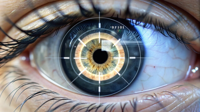 Macro image of a human eye with precise reticle overlay, highlighting accuracy in modern corrective vision procedures such as glaucoma treatment and refractive surgery.