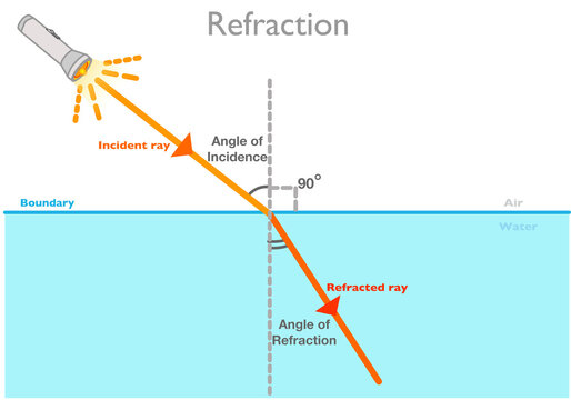 Refraction light at the interface between two media of different refractive indices. Refraction and incident angles of ray in air and water. Way of the lamp light with arrows. illustration vector