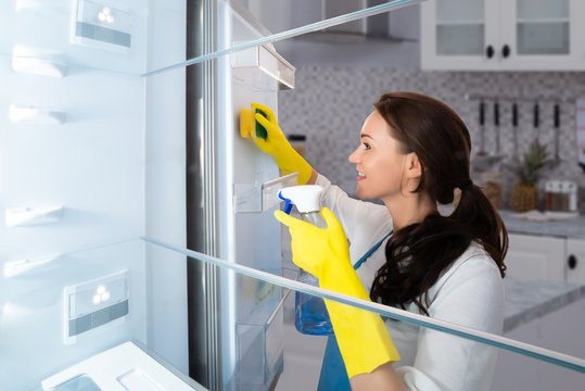 Young woman cleaning refrigerator with spray cleaner