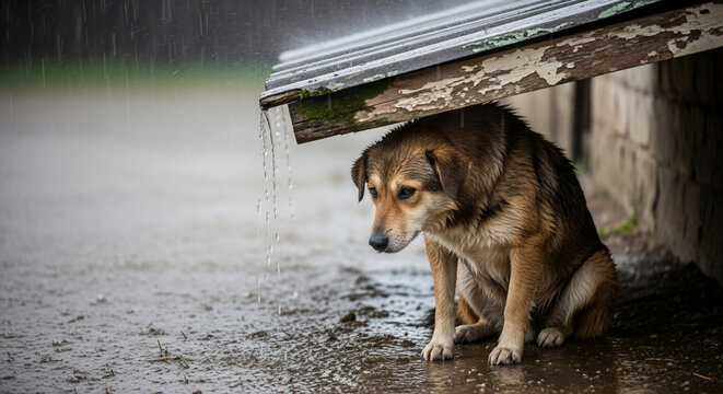 A heartbreaking portrait of a lonely homeless dog seeking refuge from a cold and stormy downpour outside