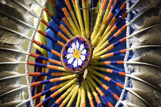 Powwow.  Native Americans dressed in full regalia. Details of regalia close up.  Chumash Day Powwow and Intertribal Gathering.
