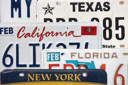 Old US car license plates with various state names. Concept of driving in United States. Reaching a car registration