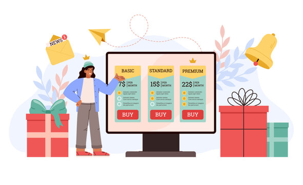 Woman and huge computer monitor with various subscription rates flat style