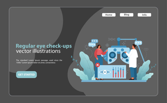 Regular Eye Check-Ups Illustration. A patient engages with eye examination equipment as a doctor assists.