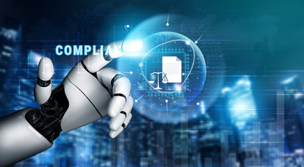 Compliance in business concept. Laws concept. Enforce laws, regulations and standards, comply with business policies, Businessman use tablet with compliance icon on virtual screen.