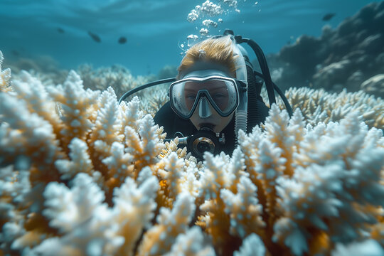 A coral restoration project underway to rehabilitate damaged reef ecosystems. Scuba diver exploring vibrant coral reef in underwater natural environment
