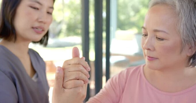 Senior asian woman receiving physical therapy, therapist assisting with hand exercises