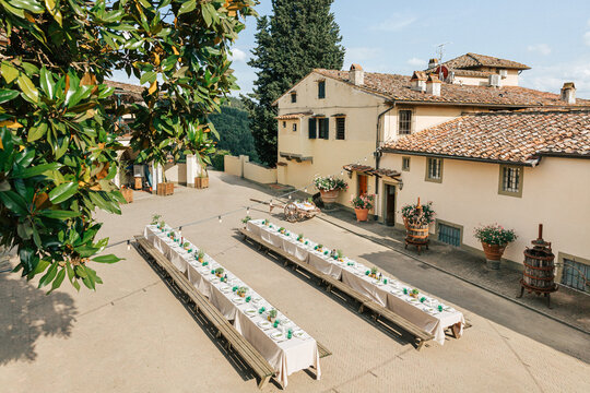 Aerial view of long rustic wedding tables. Romantic outdoor dinner in Tuscan villa courtyard. Italian event with eco style decor