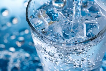 Glass of cool water overflowing, ice cubes in motion, crisp blue background