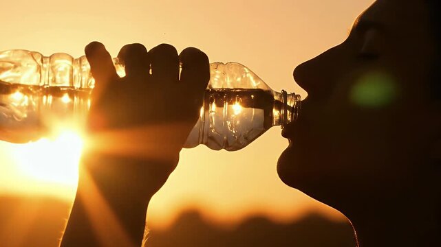 Person Silhouetted Drinking Water from a Bottle at Golden Sunset Refreshing Hydration During Warm Evening Glow Outdoor Healthy Lifestyle Wellness