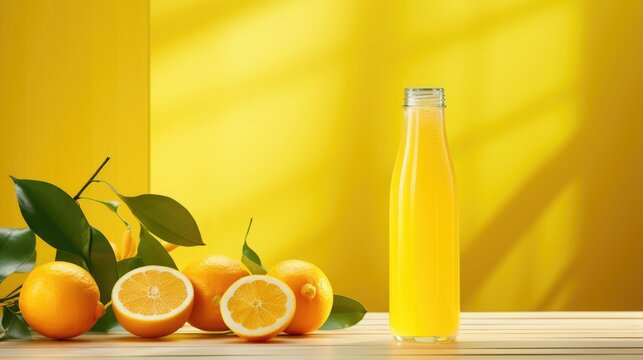 Electrolyte drink with cold pressed lemon and yuzu juice in a glass bottle, minimalist still life