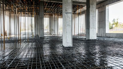 An aerial view of a construction site with a reinforced concrete foundation framework for a new building