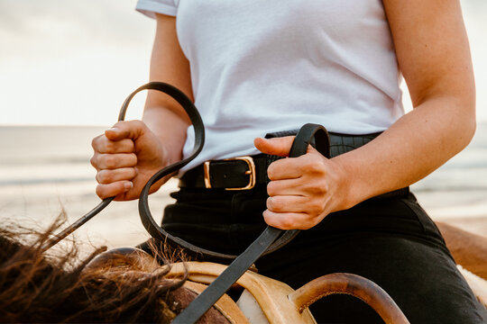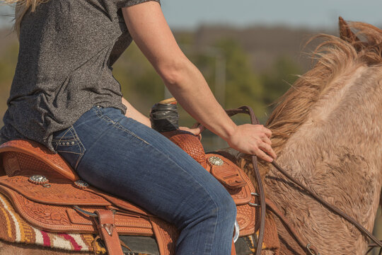 Closeup riders hands on reins riding roan quarter horse in a western show saddle
