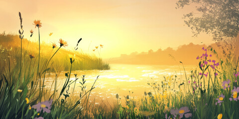 A tranquil meadow at dawn with dew-covered grass, wildflowers swaying in the breeze, and soft golden light bathing the landscape. The serene scene feels rejuvenating and fresh.