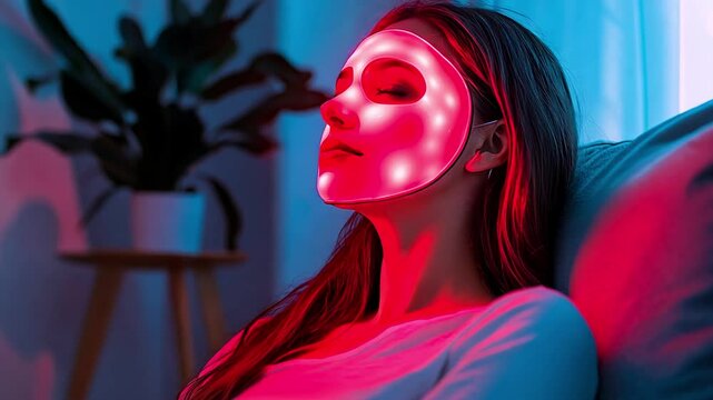 A woman lies with a face mask emitting red light, appearing relaxed. The mask is used for light therapy or skincare treatment in a spa or home setting