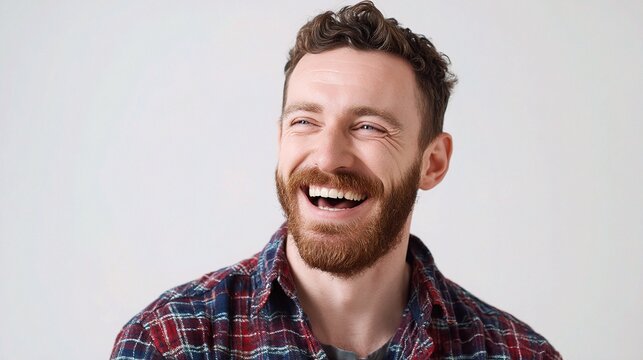 Joyful Laughter of a Man in a Plaid Shirt Captured Candidly