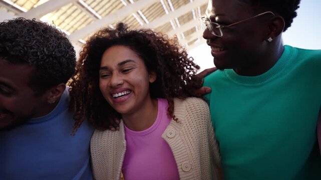 Group of diverse genders and races friends lined up laughing and embracing while looking at each other. Multi-ethnic generation z young people having fun together in relationships outdoor