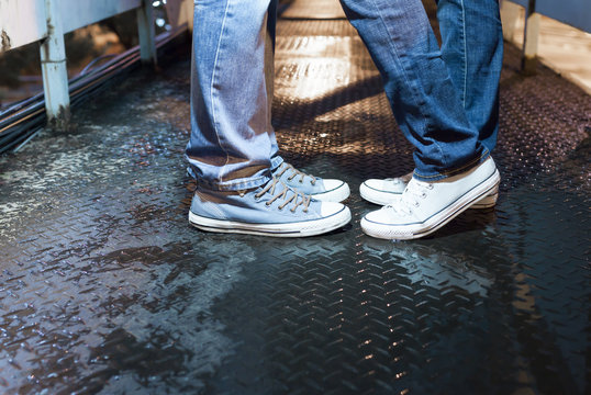 Close up of young couple's feet in a night time setting. Love and relationship concept.