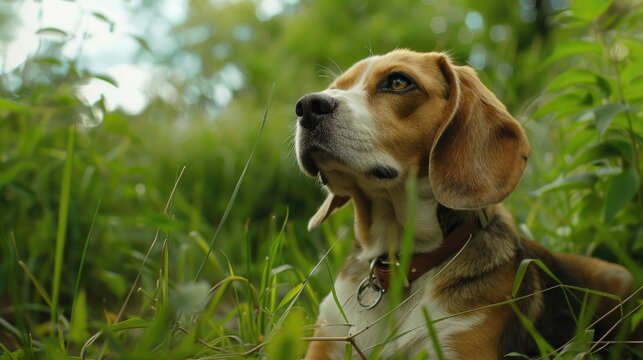 A dog sitting peacefully in tall grass. Suitable for pet care advertisements