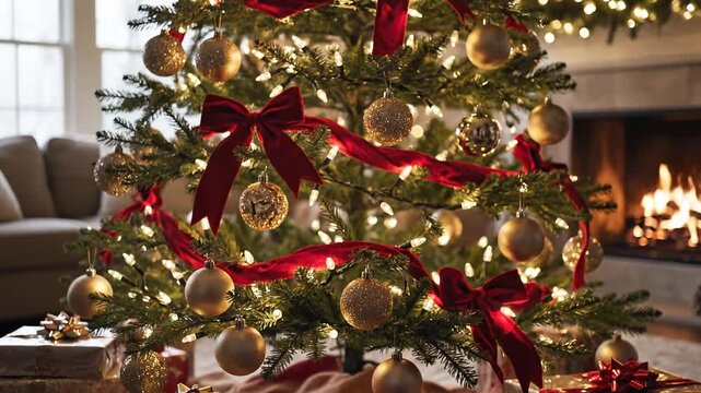 Festive Christmas Tree with Glowing Lights and Presents by a Warm Fireplace.