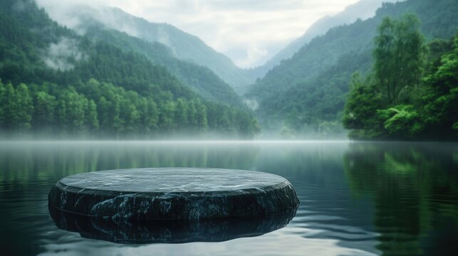 A stone display pedestal on a still lake with ripples, surrounded by foggy mountains and lush greenery. The scene is perfect for showcasing products in a natural, serene setting.