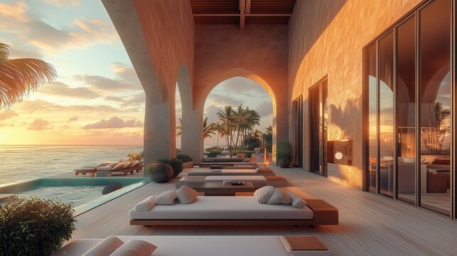 Tranquil desert retreat featuring adobe architecture, lush gardens, and serene lounging areas