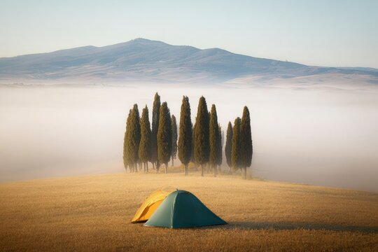 Camping amidst Tuscany's serene landscape, enveloped in morning mist. Discover peaceful retreats and breathtaking vistas in nature's embrace.