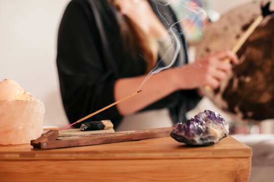 Incense sticks burning in a traditional burner with smoke swirling. Close-up of a spiritual ritual in a dark, atmospheric setting. Meditation and relaxation concept