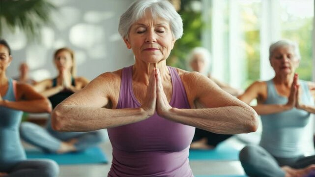 Group of focused elderly individuals practicing yoga, emphasizing relaxation, mindfulness, and healthy lifestyle during a serene indoor session.