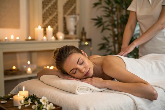 Young European woman enjoying relaxation atmosphere during full body massage at spa, room decorated with candles, side view therapy relax candle table massaging lifestyle luxury sleeping enjoyment