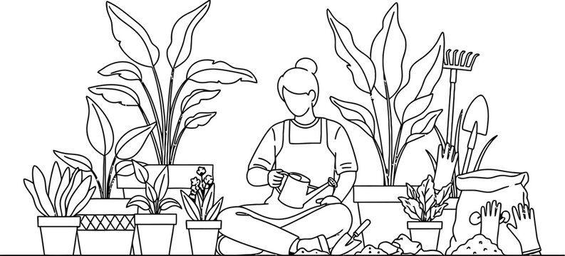A woman sitting among potted plants and gardening tools on the floor with a watering can